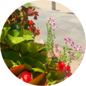 花壇にはベゴニアやマーガレットなど、色とりどりのさまざまな花が丁寧に植えられています。