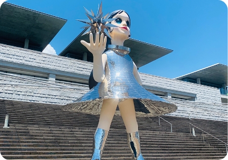 美術館の南側には、印象的なオブジェが立ちます。2015年に建てられたこのオブジェは彫刻家のヤノベ ケンジ氏による「Sun Sister」。高さは約6mあり、見応えがあります。この像は、過去・現在・未来を見つめ、希望の象徴としての「輝く太陽」を手に持ち大地に立つ少女の像。「Sun Sister」は阪神・淡路大震災20年のモニュメントとして建立されました。東日本大震災の復興を祈念して建立された子ども像「Sun Child」(2012年茨木市)の姉のような存在であり、世界中のすべての災害からの復興・再生を見守っています。