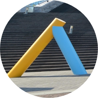 屋外彫刻作品「きいろとぶるう」。安藤氏の依頼により、美術家の元永定正氏がプランを描いて立体作品に仕上げたもの。高さ3mで、色鮮やかな直径60cmの2本の円筒が寄りかかるように地上に立っています。「人」という字にも見え、支え合うことにより生まれる力が表現されています。