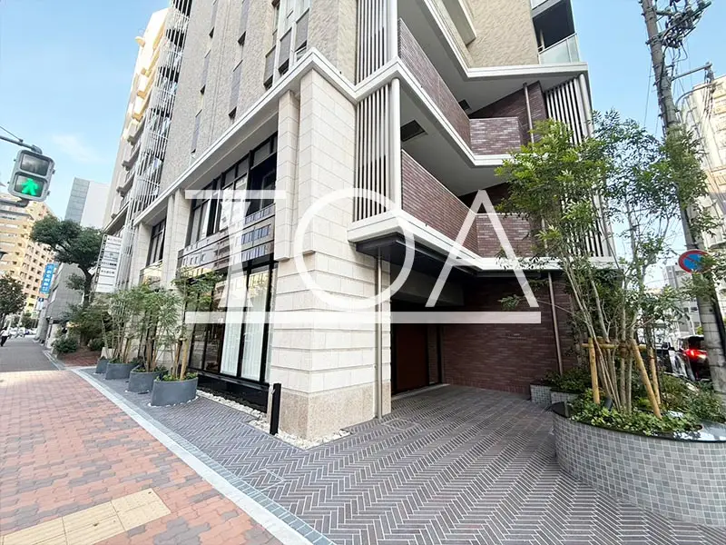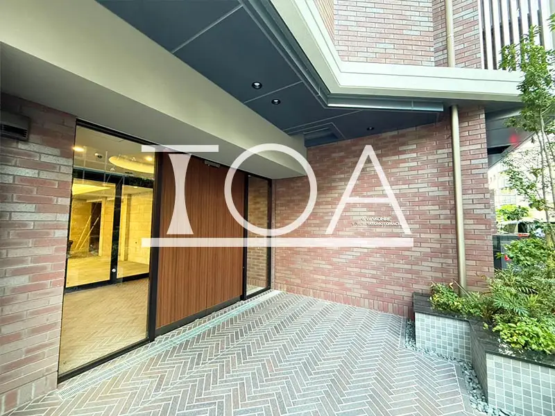 エントランスアプローチは、風合い豊かなレンガ調タイルと堂々たる柱の構成が印象的。歴史ある街並みの中にありながらも、洗練と落ち着きが調和するレトロモダンなデザインが際立ち、神戸らしい都会的な美意識を感じさせる佇まいです。