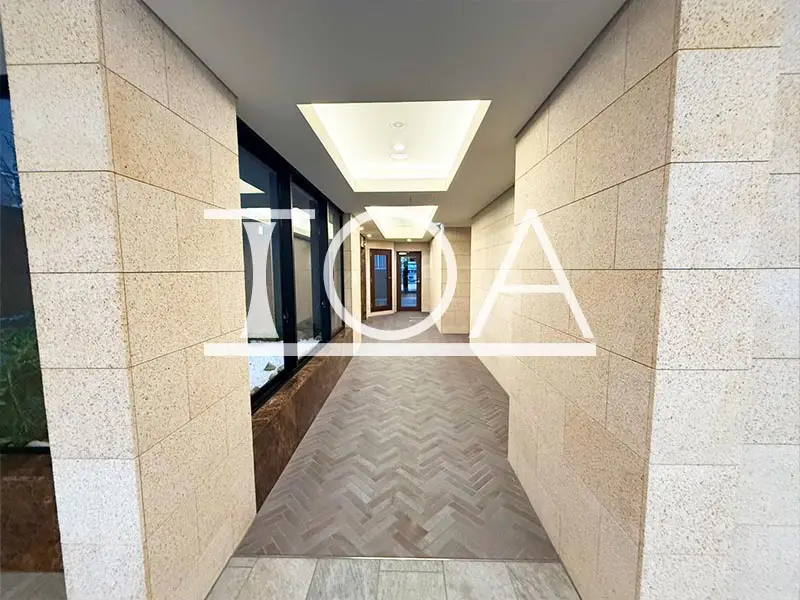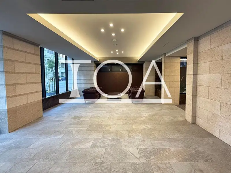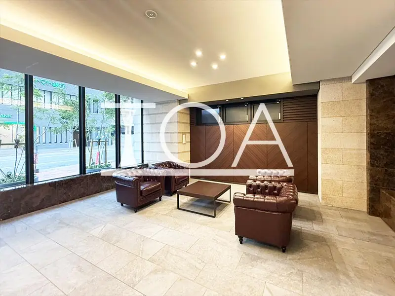 エントランスホールは、大きな開口部から栄町通の景観を取り込み、まるで街の風景そのものをインテリアとして愉しむような空間。フロアには石調の大判タイル、壁面には天然石を採用し、ラグジュアリーな趣を湛えたデザインに仕上げられています。