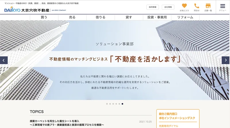 大手不動産会社7社が提携する「メジャーセブン」のひとつ、大京グループで、東京都渋谷区の本社を筆頭に、全国各地にネットワークを持っています。オリックスグループに属しており、1988年の会社設立以来、マンション・不動産の仲介(売買・賃貸)、売却、賃貸経営を担ってきました。過去に分譲したライオンズマンションやサーパスマンションの膨大なストック戸数も強みです。現地に詳しいスタッフに直接相談できるよう、全国の店舗にテレビ電話システムを導入、遠方の不動産についても気軽に相談できます。